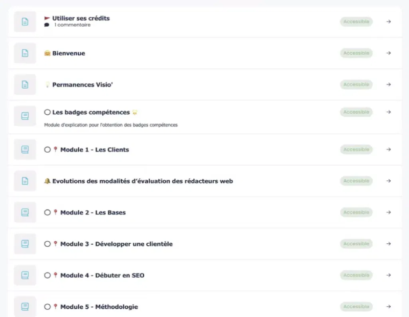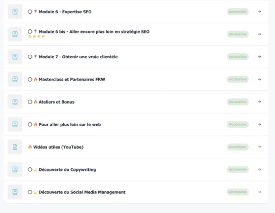 - Une formation trĂšs dense : Entre vidĂ©os, exercices pratiques et Ă©tudes de cas, il faut compter 3 Ă 10 heures/semaine. Pas de place Ă la passivitĂ© : vous devrez jongler entre les modules sur le SEO, le dĂ©marchage et lâorganisation.Â
